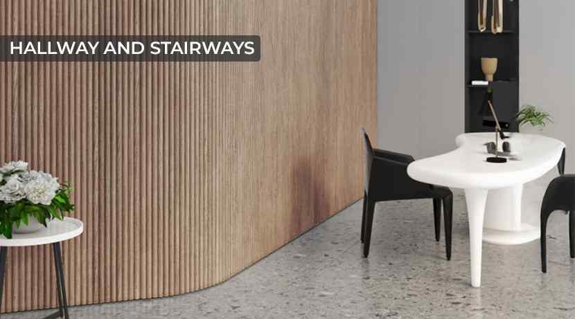 Statement hallways are trending in 2026. Use acoustic decorative panels along staircases or corridors to add texture, elegance, and reduce echo, especially in tall-ceiling homes.