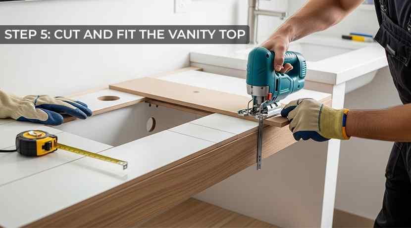 Whether you have chosen a pre-made countertop or have created one yourself using wood or tiles, cut it and fit it to the top of your vanity unit after cutting a hole for the sink using a jigsaw. If you are making a tiled vanity top, you must use a waterproof adhesive and grout in order to ensure that your tiled top remains lasting and protected for years.