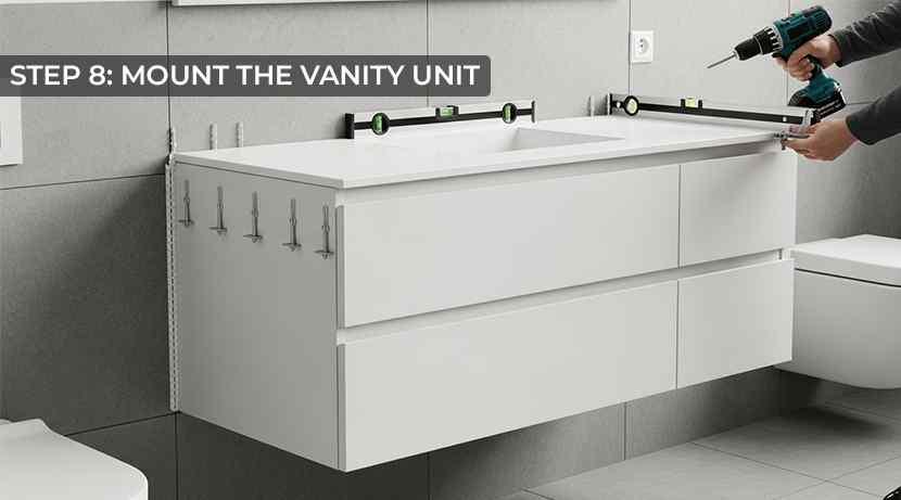 Secure your vanity unit to the wall with the help of wall anchors and screws (especially for your floating design). Level your vanity unit properly before sealing the edges with caulk.