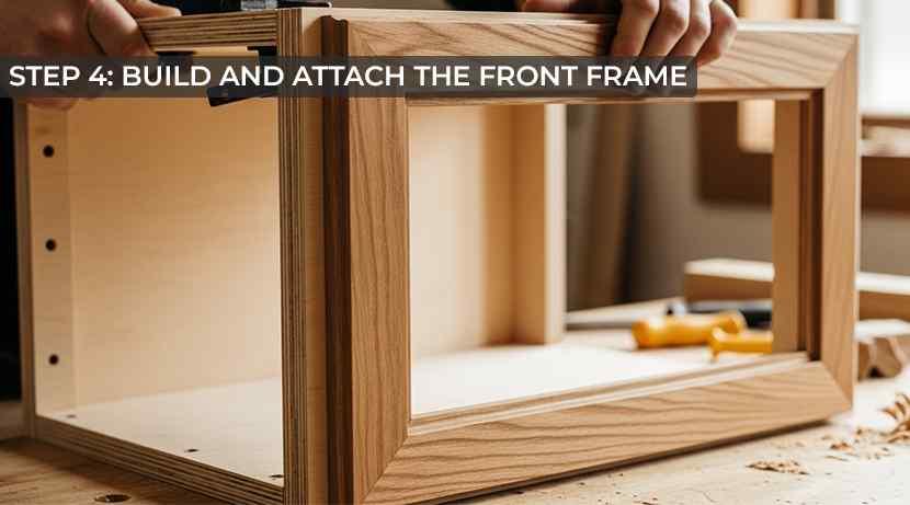 Attach your front frame made of 1×2 hardwood boards for a polished and clean look. This conceals the rough edges of your plywood, giving it a professionally finished appearance.