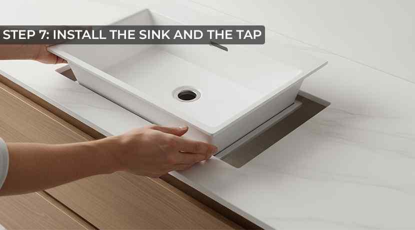 Place your sink or bowl into the cutout of your top and connect the plumbing. Use a silicone sealant in order to prevent leaks and warping.