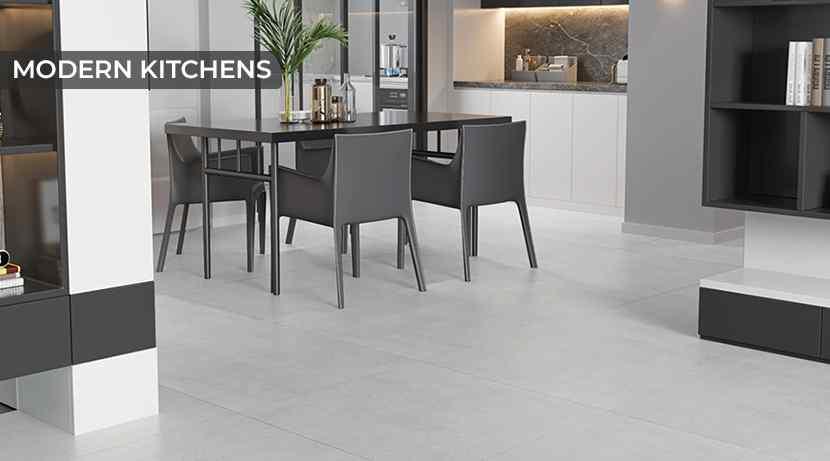 Concrete-effect and stone-effect tiles play a crucial role in creating a sophisticated and urban look. If you want a minimalist kitchen, opt for matte finishes, which are smooth and have excellent foot grip for your kitchen floors.