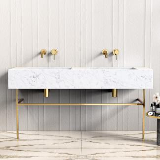 A smart and luxurious unit for modern bathrooms, designed using single Carrera marble block, handpicked from the most premium quarries. Take a look at this 1200mm Carrera Marble Vanity Unit with brushed gold stainless steel legs.