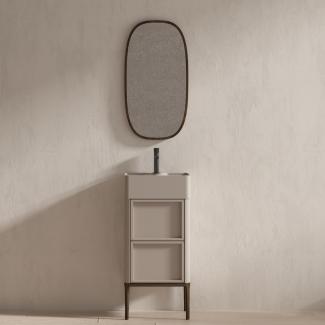 The soft, matt grey colour and the sleek, gloss-white gel-coated basin complement each other. Made using high-quality plywood, this unit stands on solid wood legs with a black walnut lacquer finish. It adds warmth and refinement to modern bathrooms.