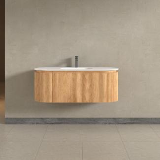 It is crafted using high-quality marine plywood, adorned by a solid wood fluted design on top. The marine plywood structure promises unparalleled strength and resistance, even in humid climates. This bathroom vanity comes with an integrated oval white stone top with an oval shape and a matt finish. The stone basin is very smooth and its contours complement the vanity's design.