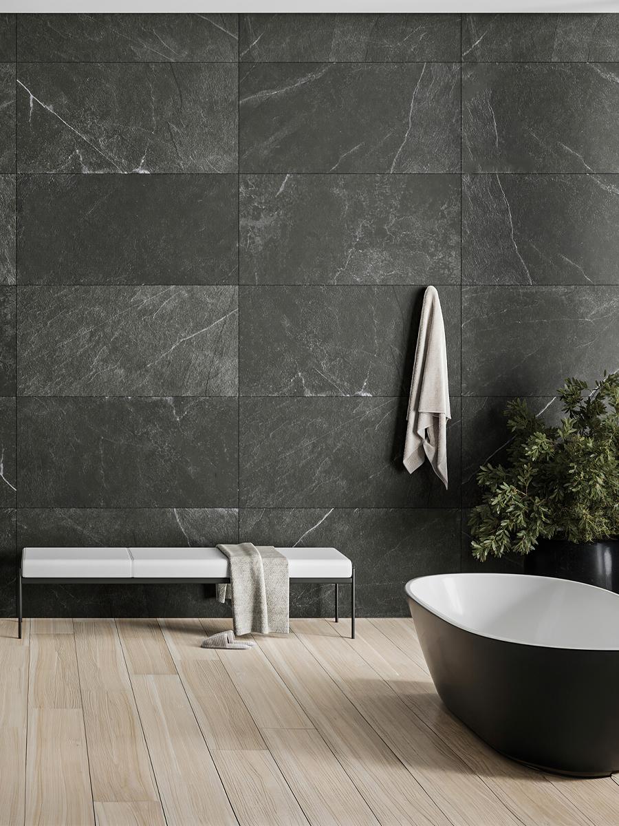 With 48 faces these premium Spanish porcelain tiles mimics the beauty of natural black slate at its best, whilst keeping the benefit of porcelain. These porcelain tiles are suitable for both walls and floors.