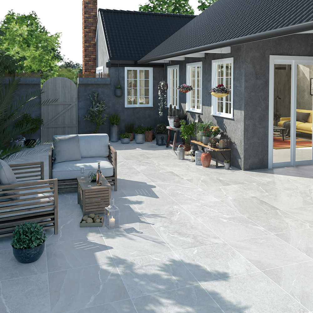 Roca White outdoor tiles has a unique character to give the look of a mixture of marble & slate and benefits of hardwearing porcelain.